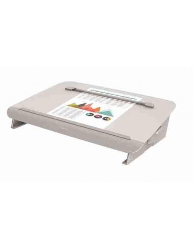 Soporte y atril que ayudan a mantener una postura ergonómica correcta, lo que evita molestias en cuello y espalda. 5 ajustes de altura (desde 116 hasta 214 mm) y ángulo (desde 8º hasta 32º). La plataforma se desliza para cubrir el teclado, maximizando el espacio de la mesa.
