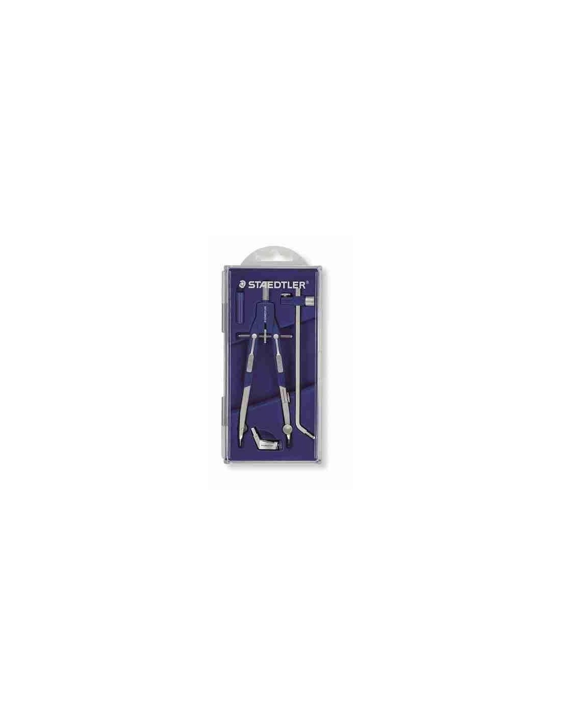 Compás de precisión con rueda central y mecanismo de ajuste rápido mediante teclas, diámetro máximo del círculo 350 mm y con alargadera 585 mm. Estuche de plástico con tapa transparente con: compás con patillas, alargadera, tubo de minas y adaptador universal de rosca.