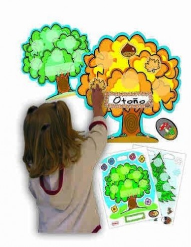 Cuatro árboles gigantes que representan cada estación con círculos interactivos con objetos relacionados con cada estación. Se pueden rotular con rotuladores de pizarra en seco. Contiene: 4 árboles, 4 tarjetas de título, 28 círculos y velcros transparentes. Medidas: 53 x 76 cm. Altura árbol: 54 cm.