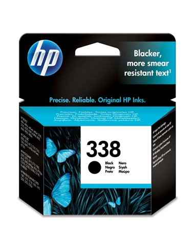 Los cartuchos de tinta HP 338 ofrecen resultados consistentes. Esta tinta negra mejorada imprime texto de calidad láser y proporciona una mayor resistencia a borrones de rotulador. Duración aproximada: 480 páginas.