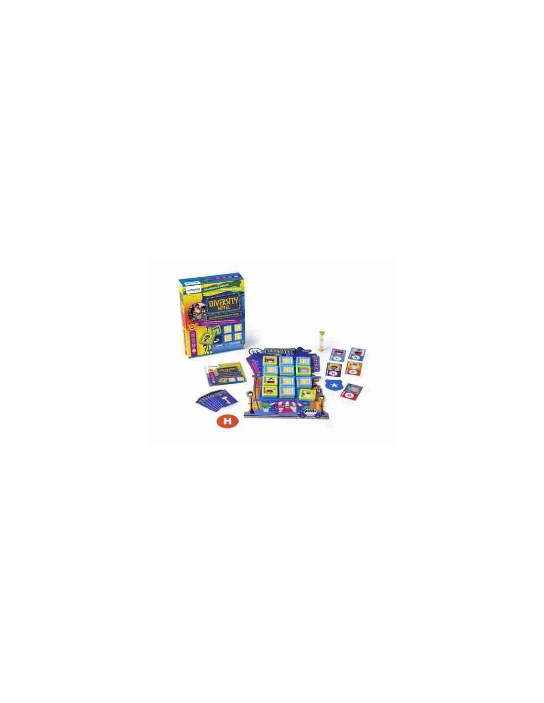 Juego de preguntas y respuestas para conocer diferentes culturas a través de los personajes e identificarlos. Fomenta el respeto hacia la diversidad y las conductas amables, favoreciendo la igualdad y la integración social, enriqueciendo el vocabulario. Contenido: 1 tablero, 12 ventanas, 26 fichas, 1 reloj de arena y 1 folleto.