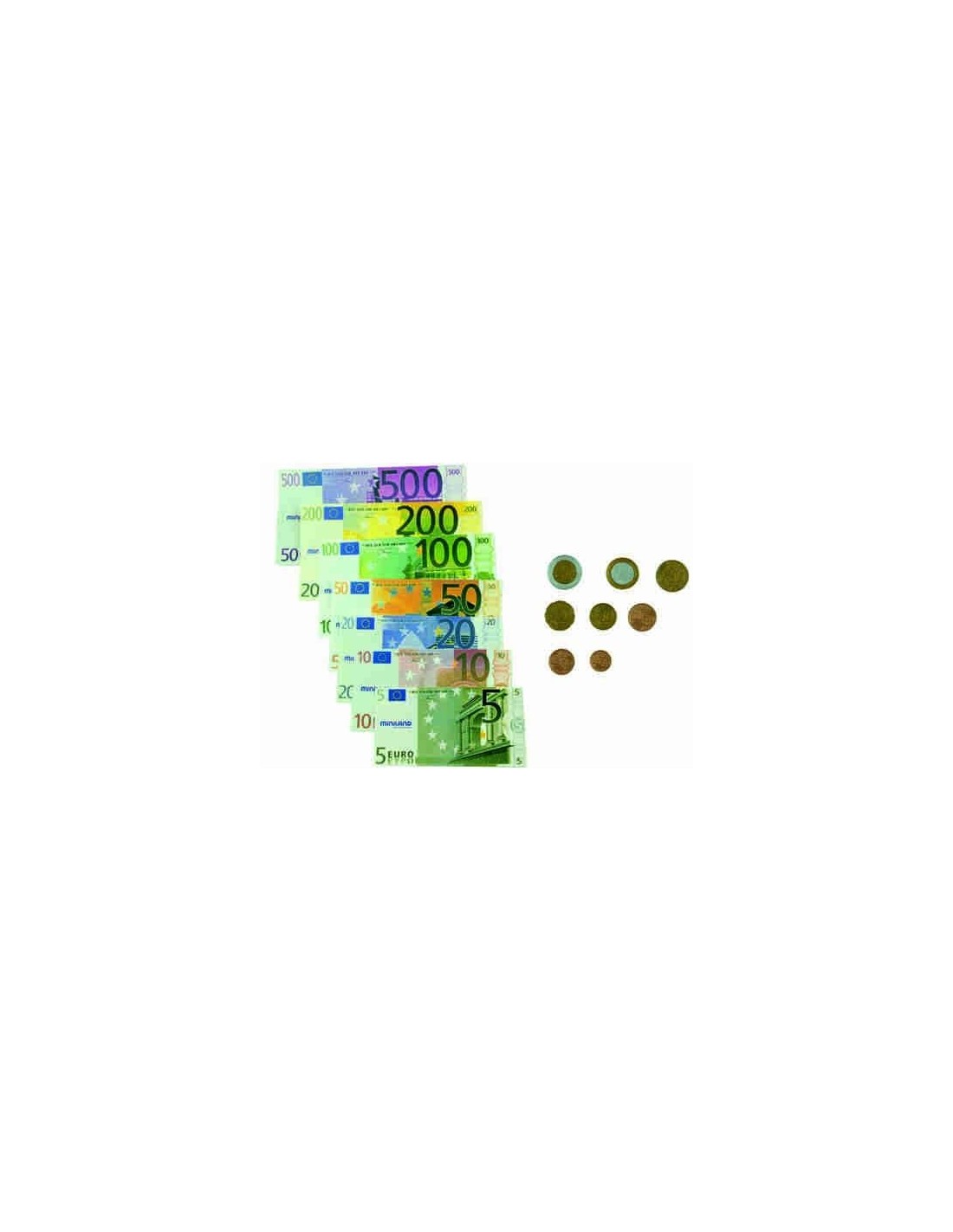 Reproducción a tamaño real de billetes y monedas de euro en plástico lavable. Contiene 28 billetes + 80 monedas + guía didáctica.