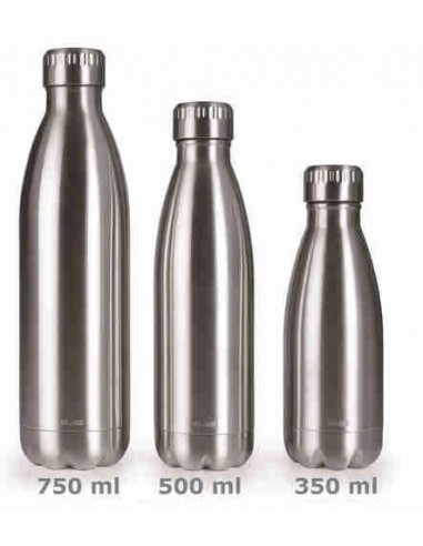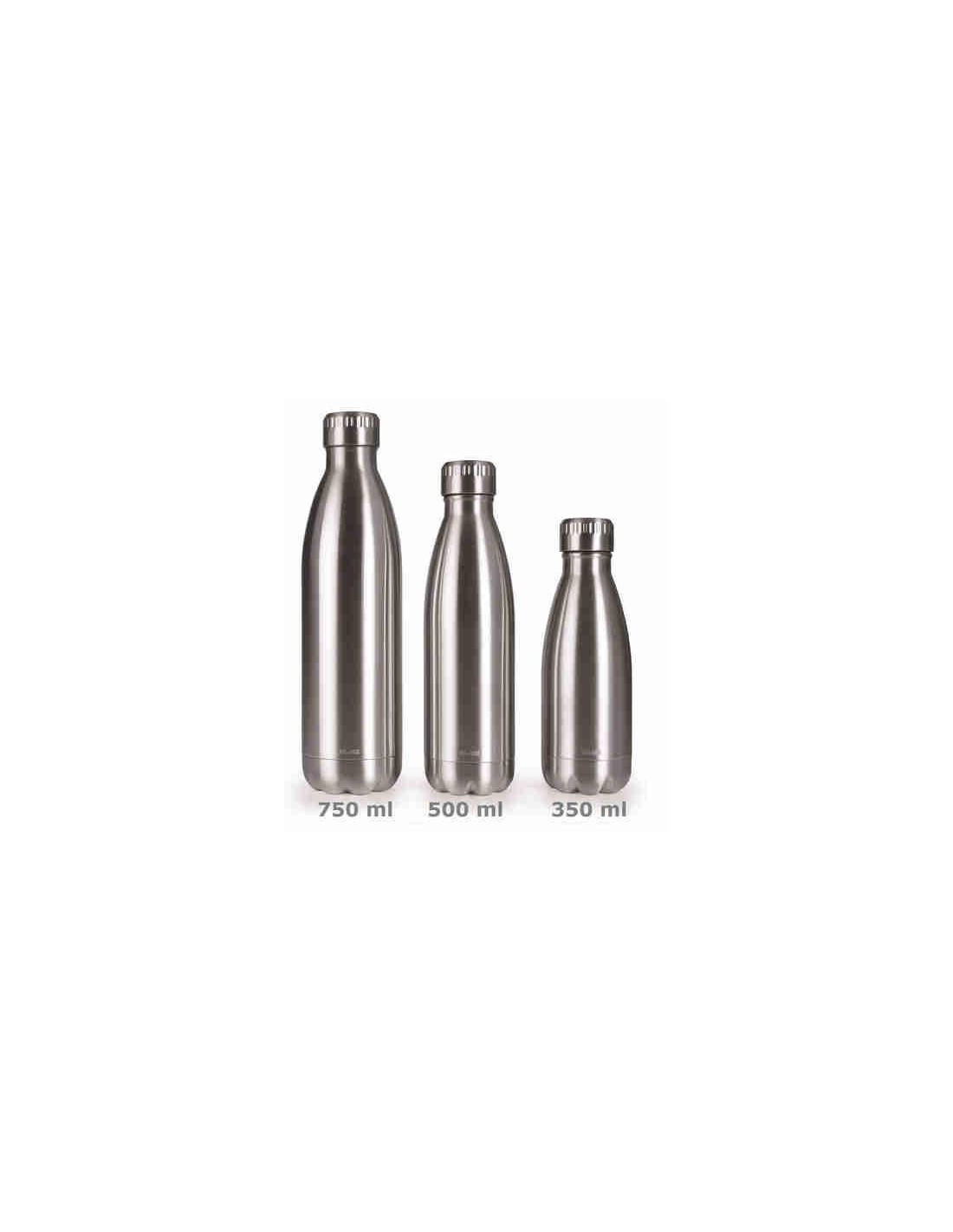 Botella termo doble pared de acero inoxidable capaz de mantener su bebida caliente hasta 24 horas. Su original diseño en forma de botella sirve para cualquier bebida: Café, té, infusiones, leche, chocolate, etc. Tres capacidades 350 ml, 500 ml y 750 ml. Modelo Satín.