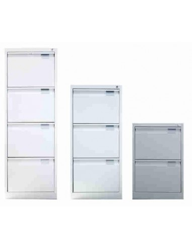 Realizados en plancha de acero entre 0.6 y 0.8 mm de espesor. Estructura soldada. Cajones con guías metálicas y rodamientos de alta resistencia de extracción total, con sistema de cierre centralizado y antivuelco. Barra móvil que permite archivar tamaño folio y D4. Cumplen normativa BS4875 punto 7. Garantía 5 años. Acabado de color gris RAL7035. Se suministran montados.