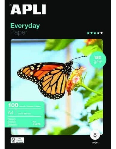 Papel de 180 gramos especialmente tratado para impresoras Inkjet color de alta resolución. Secado instantáneo. Calidad fotográfica con acabado brillante. Paquete de 100 hojas. Formato A4.