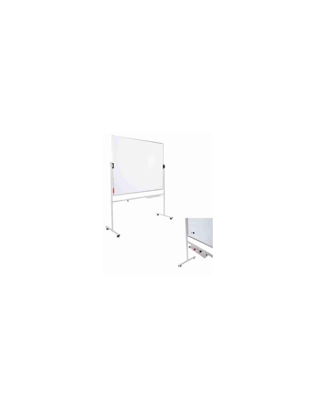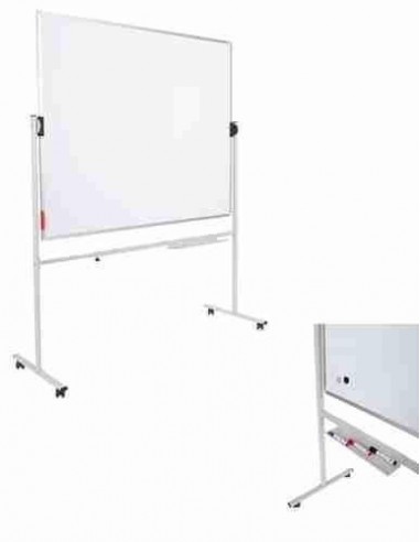 Pizarra volteable de doble cara de acero magnético con marco de aluminio anodizado. Estructura con sistema patentado de rotación que permite el giro y bloqueo de la pizarra sin necesidad de accionar ninguna palanca o pomo, aportando mayor seguridad en el giro y evitando cualquier movimiento de oscilación o vibración al escribir. Estructura con ruedas para su desplazamiento. Incluye bandeja para rotuladores.