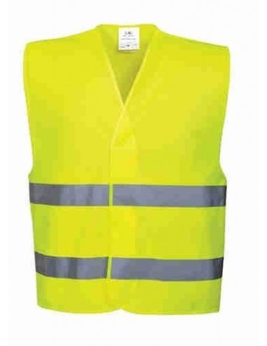 Chaleco de alta visibilidad con cintas reflectantes, escote a pico, cierre de velcro adaptable y ribeteado con bies a contraste. Fabricado 100% poliéster.